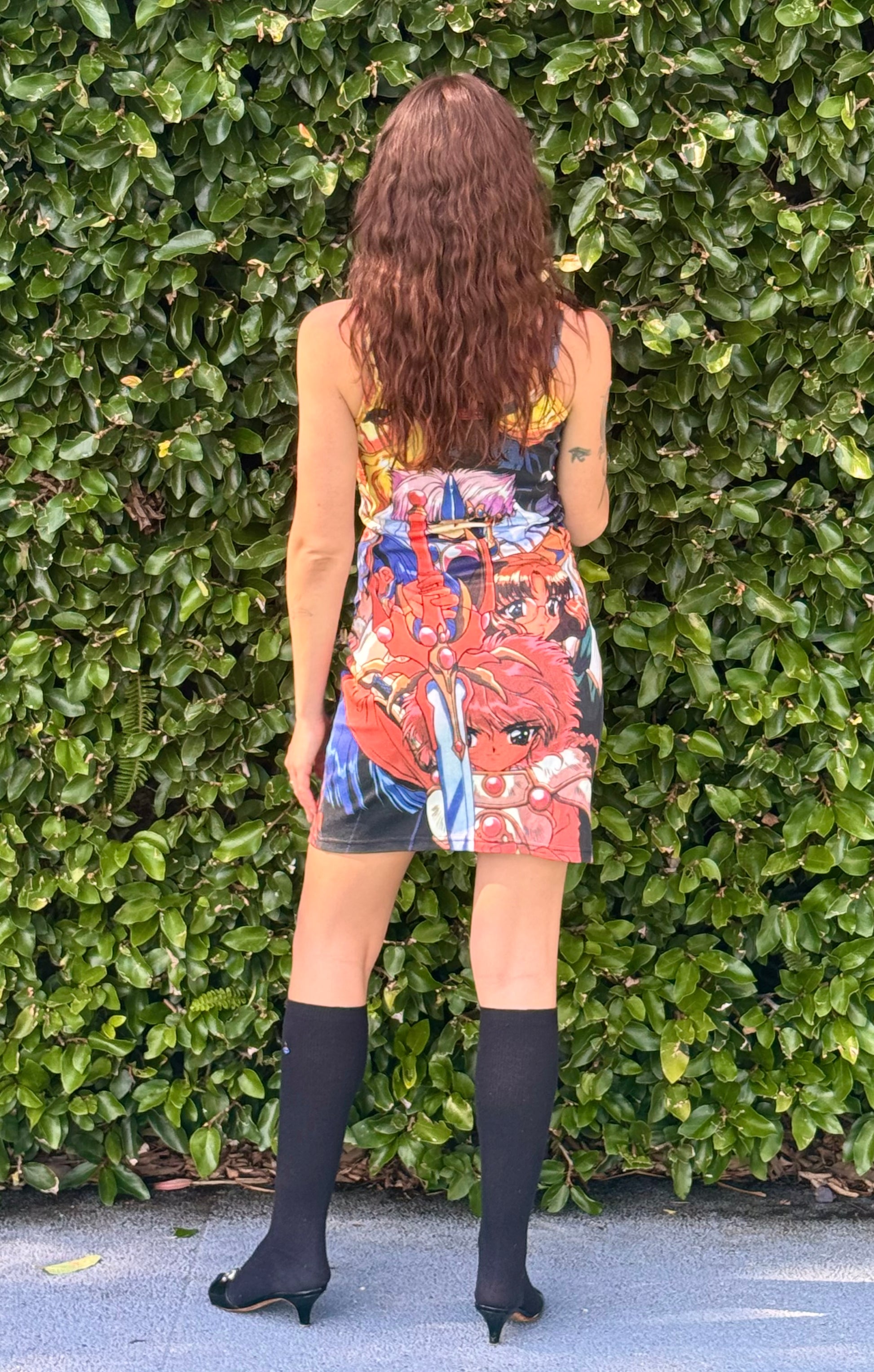 Y2k Deadstock Japanese magic knight rayearth dress. Bold and eye-catching, this bodycon mini dress features an all-over vibrant anime print with detailed design in striking reds, blues and oranges. Thin spaghetti straps and a flattering slim fit.