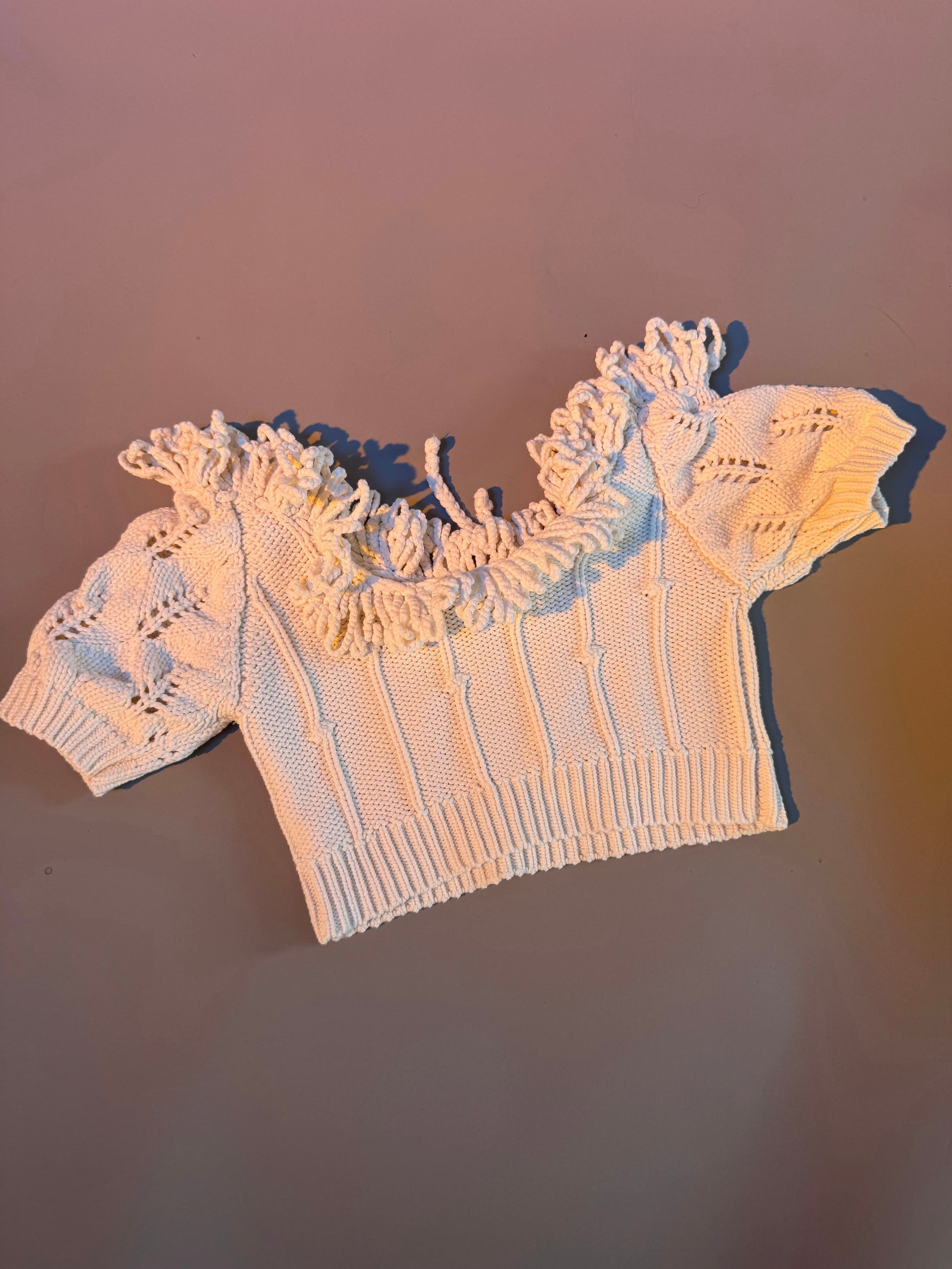 Details: Hand-knit texture, fringe neckline, puff sleeves