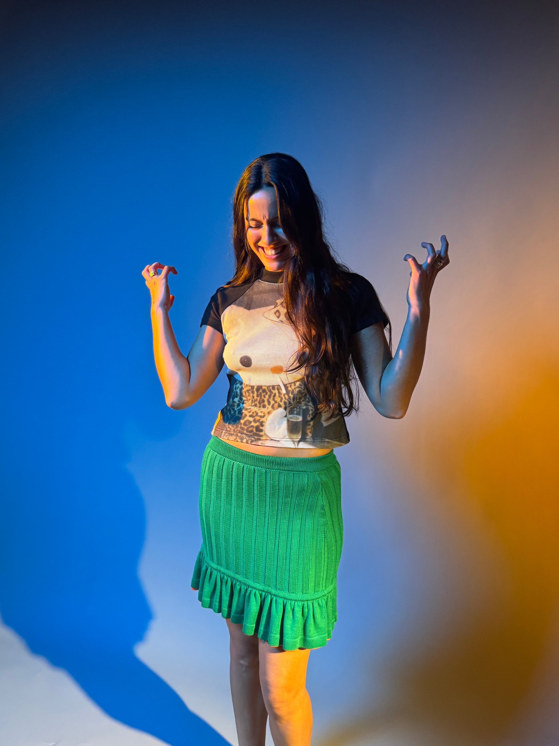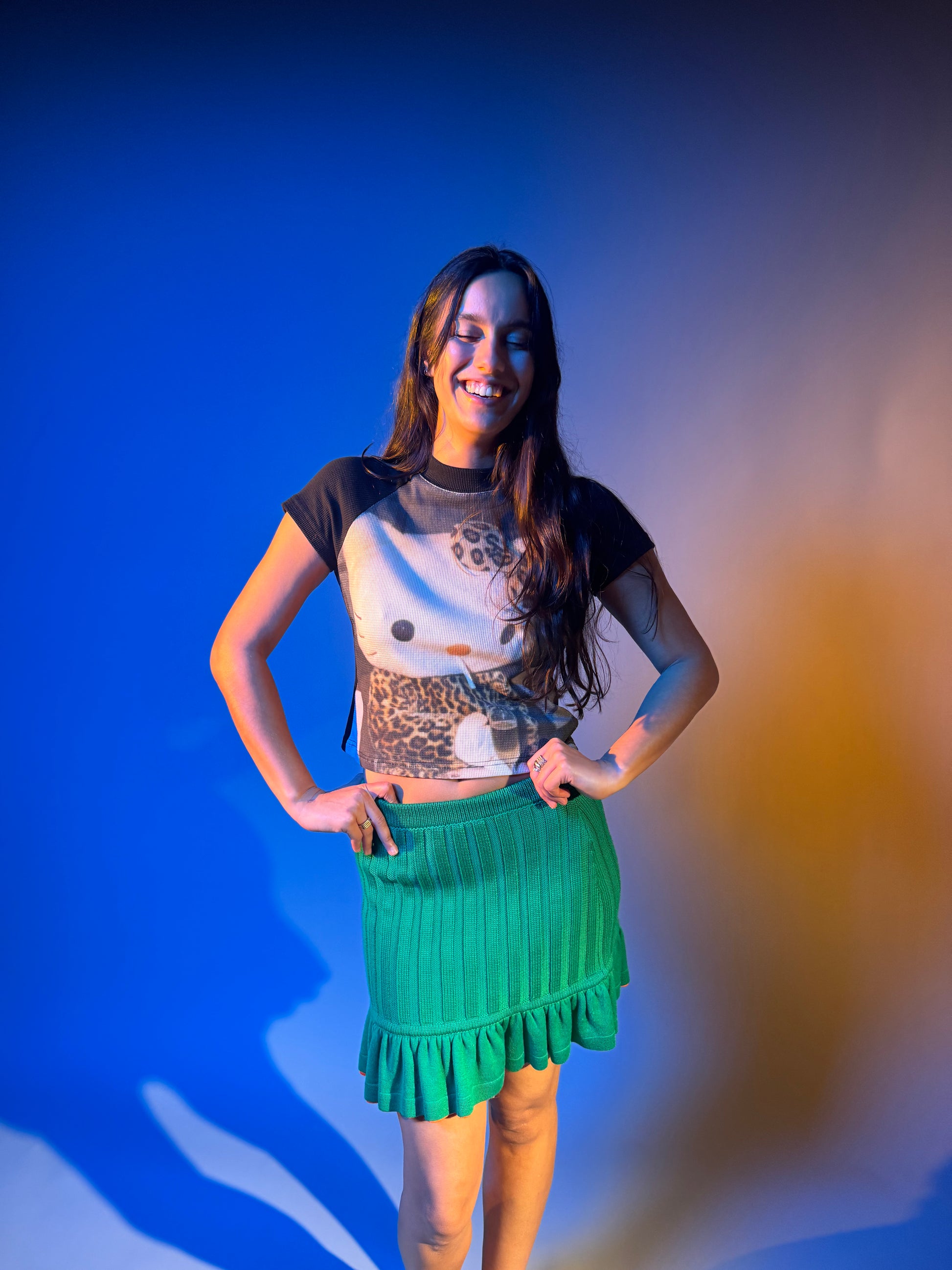 Elevate your knitwear game with this playful yet polished Miu Miu skirt, crafted in a lush emerald green tone. Made from a stretch ribbed knit, the skirt hugs the hips and gently flares at the hem with a charming ruffle detail lined with orange, adding movement and a touch of femininity. The high-waist silhouette creates a flattering shape, while the soft texture keeps things cozy and luxe.